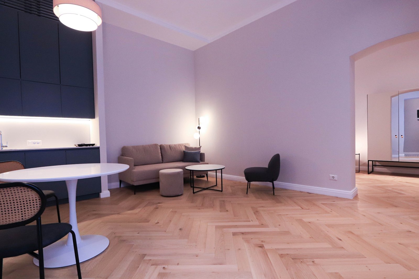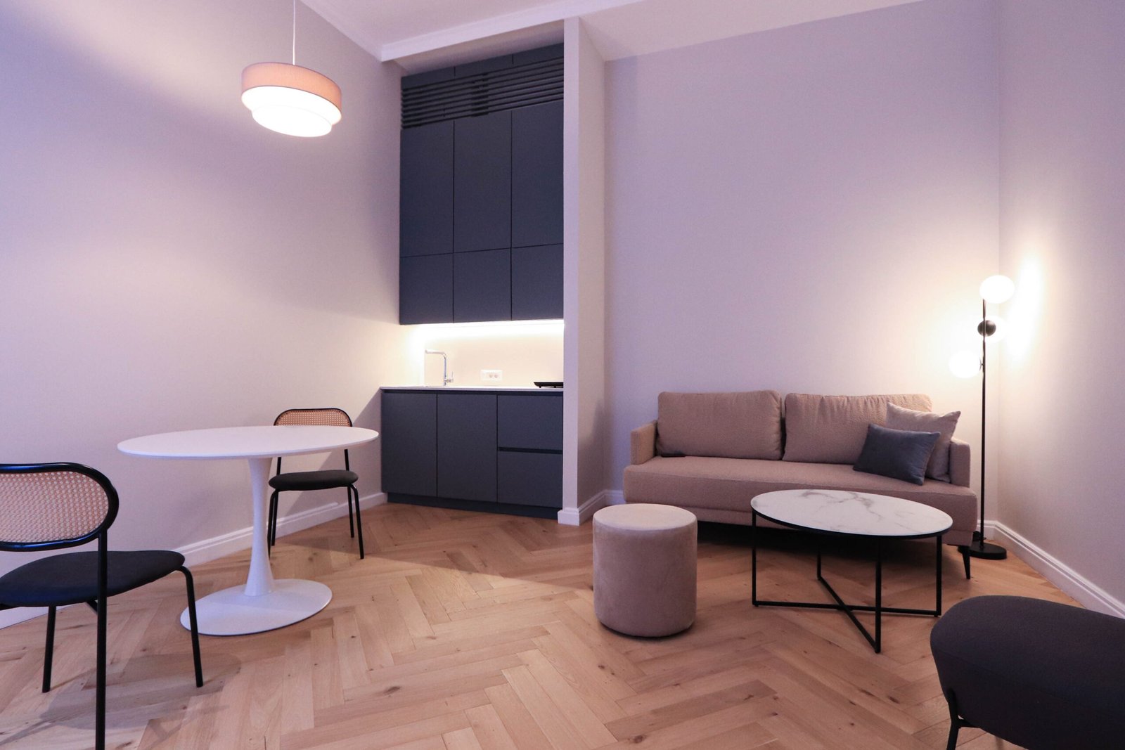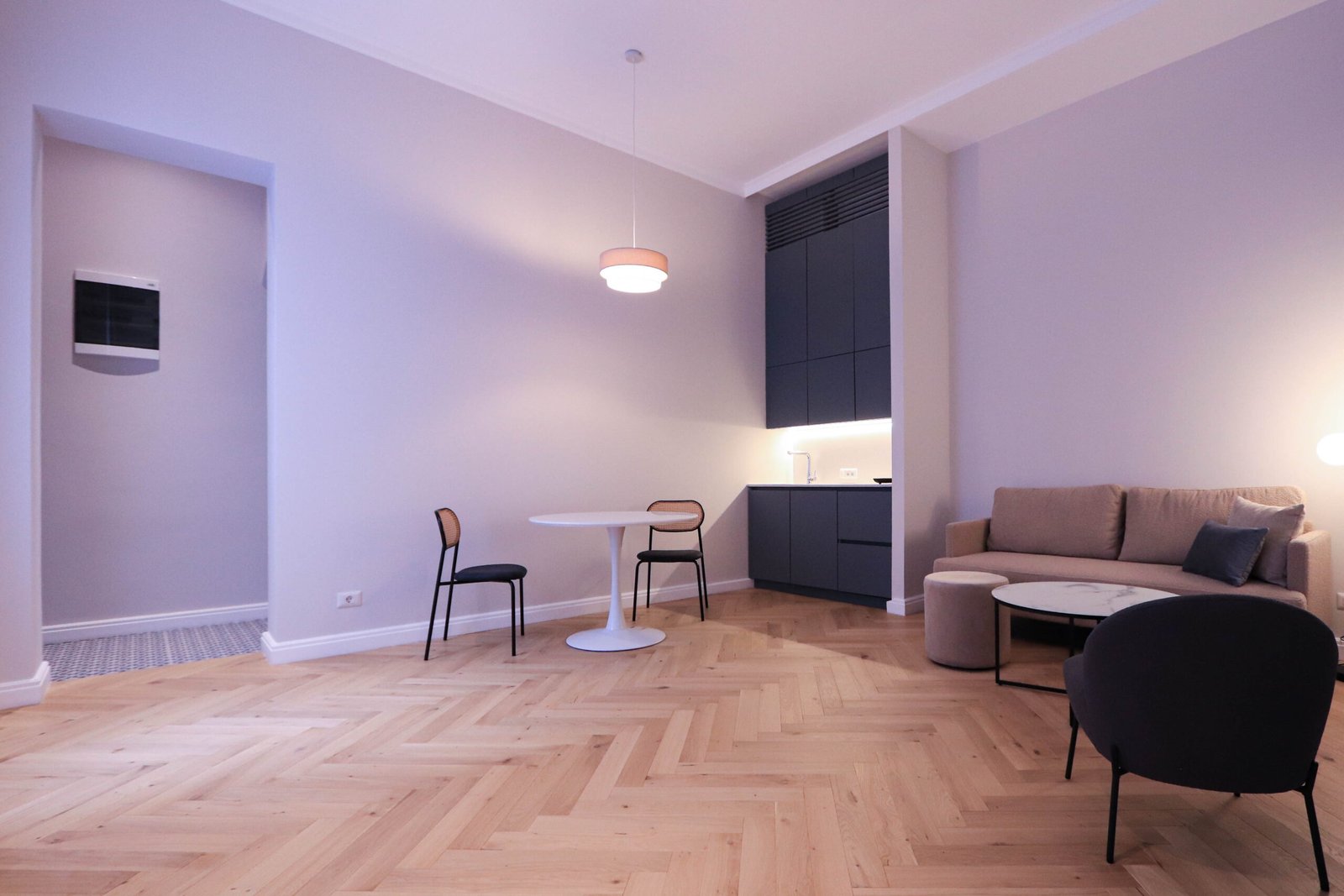 Acest ansamblu este format dintr-o mică bucătărie, living în care găsiți o zonă de servit masa și o zonă de relaxare, dormitor cu pat de două persoane, baie cu duș și bideu.